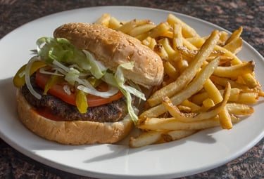 Grilled halal burgers stacked with melted cheese and crisp lettuce.